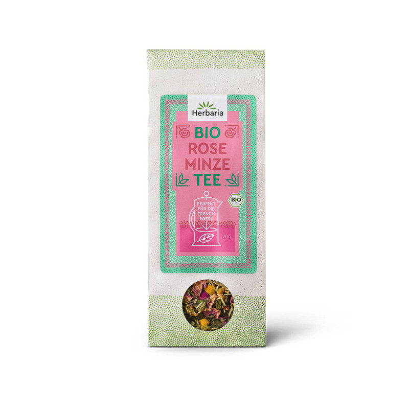 Beskrivning: Örtteblandning med rosenblad och nanamynta.